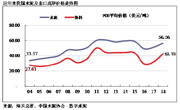 自2006年水泥出口達(dá)到高峰的3,612萬噸以后,我國(guó)水泥出口量呈明顯逐年下降趨勢(shì),主要原因:一是我國(guó)出口政策的調(diào)整,2007年國(guó)家取消了11%出口退稅的優(yōu)惠政策。二是國(guó)際市場(chǎng)需求疲軟,水泥需求缺口縮小,尤其是原來我國(guó)出口大戶美國(guó)房地產(chǎn)業(yè)投資大幅下滑,導(dǎo)致其進(jìn)口水泥大幅度縮減。2018年出口量?jī)H為904萬噸,這是自2005年以來首次跌破1000萬噸,但出口的FOB價(jià)格連續(xù)三年回升,2018年達(dá)到56.6美金。